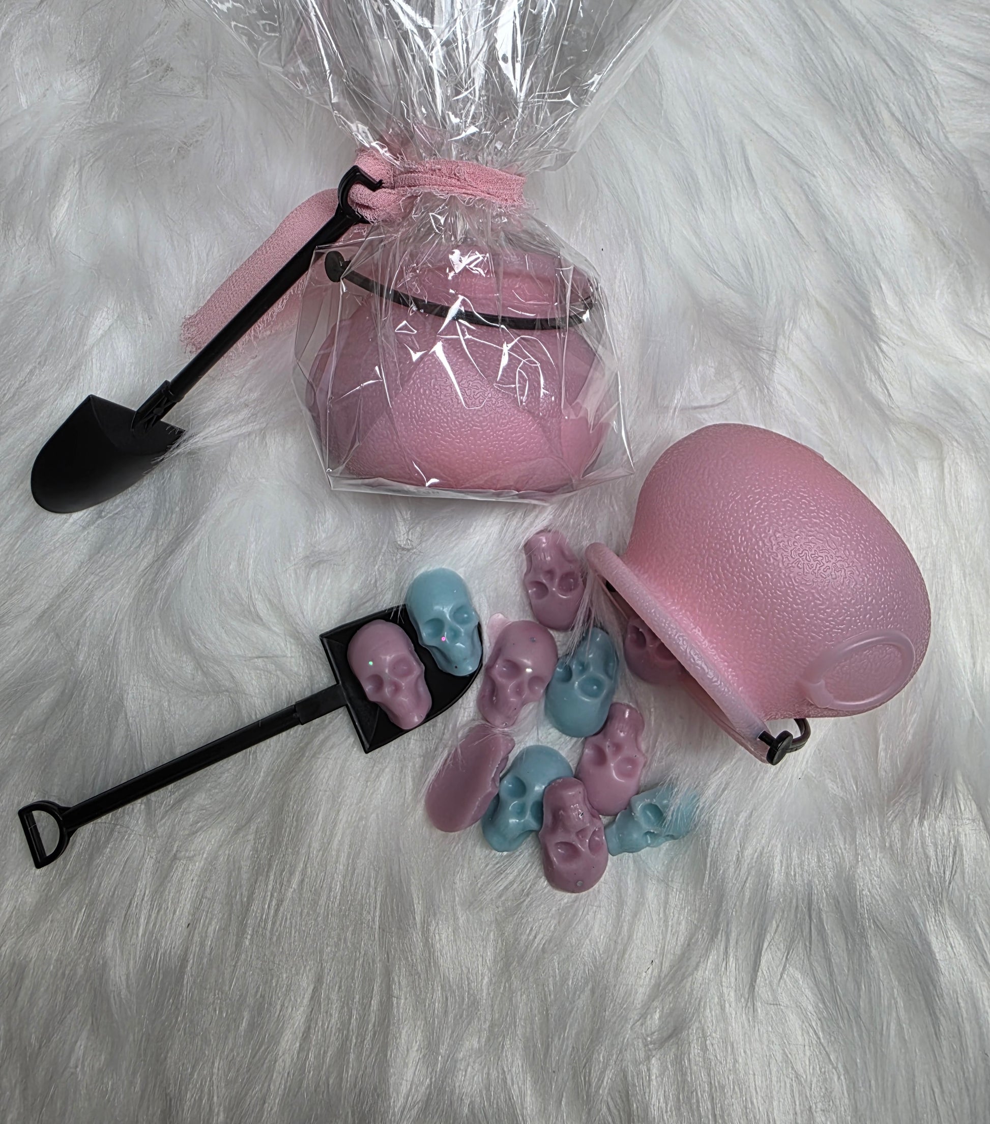 - A reusable plastic cauldron, brimming with 30 mini skull-shaped wax melts